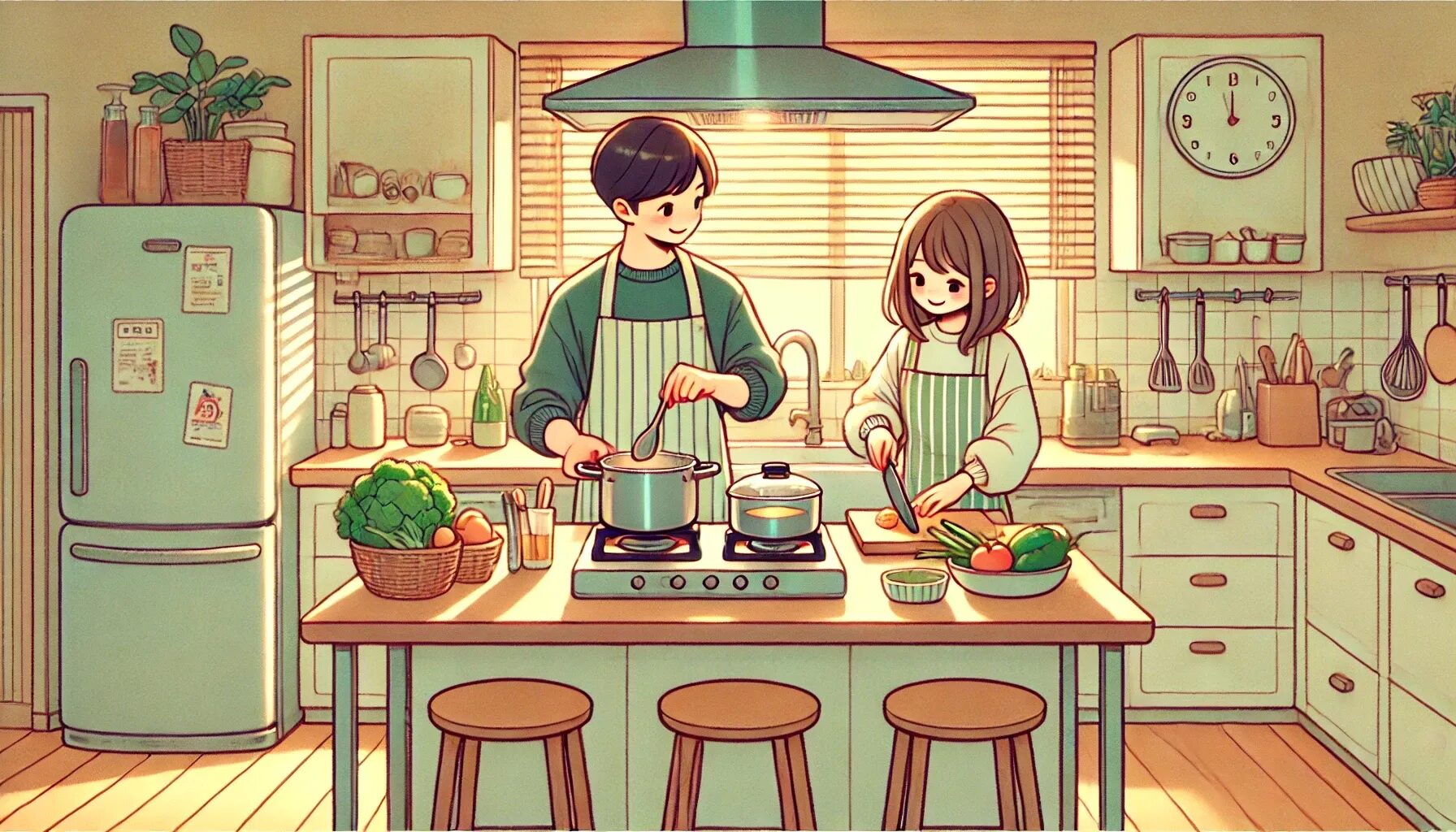 - **”Organize Shared Workspace”**To effectively utilize limited kitchen space, clearly dividing work areas is helpful. Work flows more smoothly when you organize traffic flow, such as designating the right side of the counter for prep and the left side for cooking. Also, place frequently used utensils and seasonings in the center where both people can easily access them.
